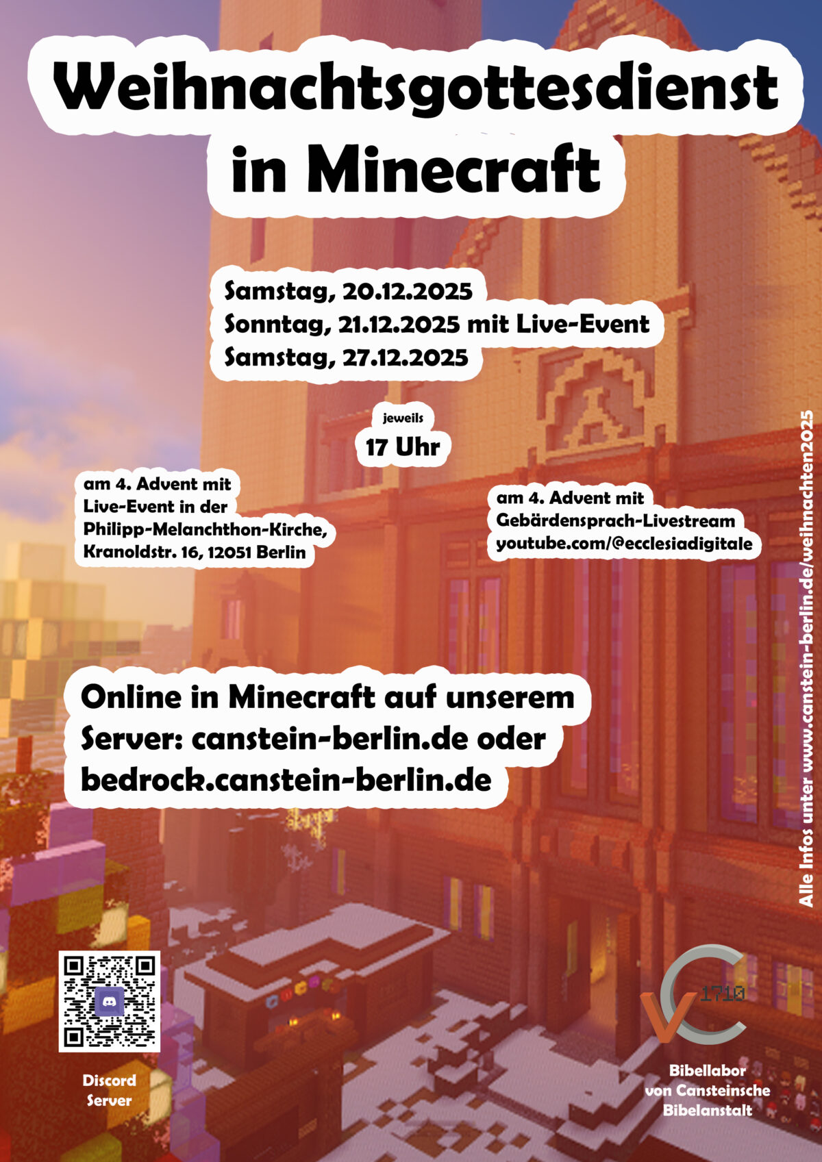 Am 4. Advents-Wochenende und nach den Weihnachtstagen bietet das Bibellabor wieder Gottesdienste im Online-Spiel Minecraft an. Die Weihnachtsgeschichte wird gemeinsam interaktiv erlebt. So viel wird schon verraten: Es wird himmlisch! Gemeinsam bauen, planen und gestalten engagierte junge Menschen ehrenamtlich die digitalen Gottesdienste – und schaffen damit einen Ort, an dem Freude, Gemeinschaft und Glaube auf moderne […]