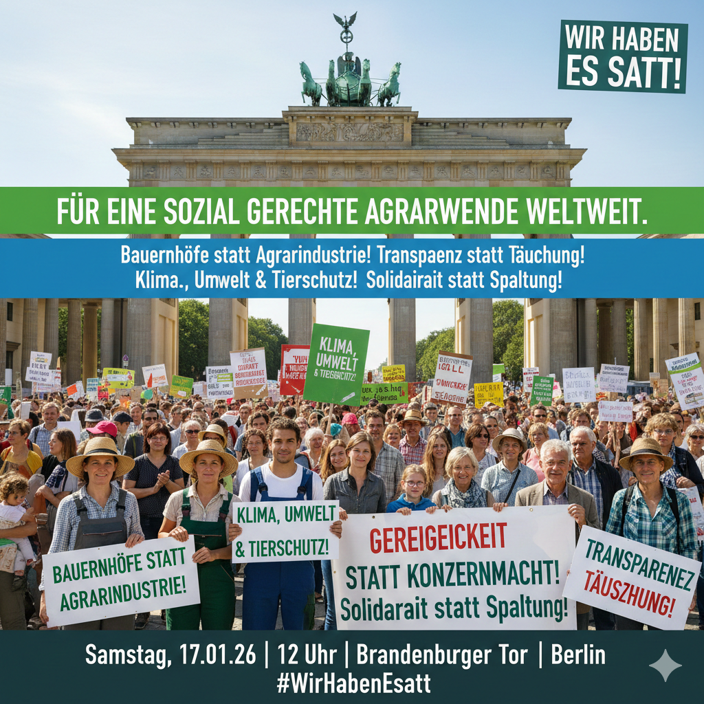 Bäuer*innen und Verbraucher*innen, Stadt und Land, bio und konventionell, Tierhalter*innen und Veganer*innen. Kommt zur „Wir haben es satt!“-Demo!