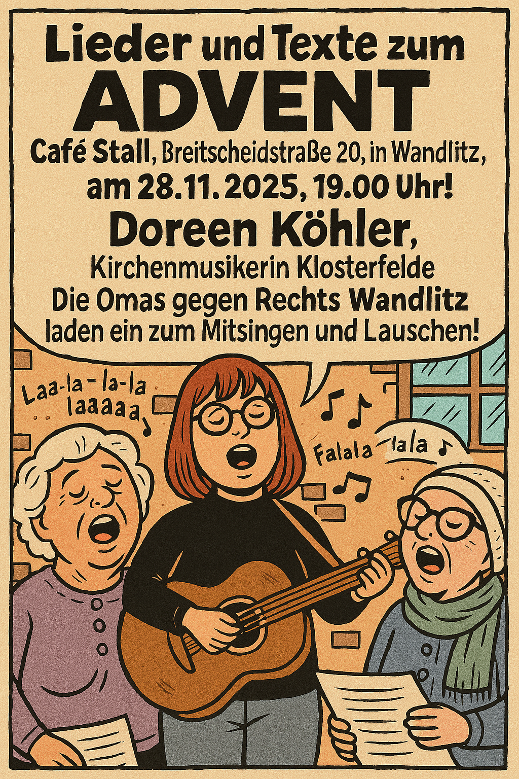 Freuen Sie sich auf einen stimmungsvollen Abend voller Musik und Worte. Gemeinsam mit Doreen Köhler, Kirchenmusikerin aus Klosterfelde, laden die Omas gegen Rechts Wandlitz ein zum Mitsingen und Lauschen.
