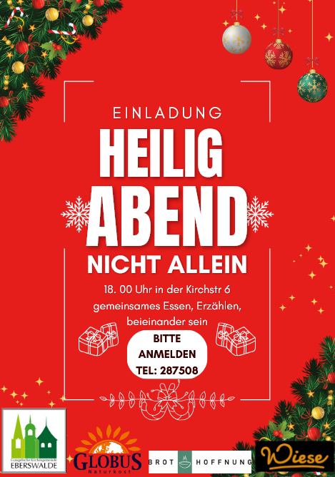 Letztes Jahr schrieb ich, welche Angebote es für einsame Senioren in Wandlitz und Umgebung an Weihnachten gibt. Und auch dieses Jahr möchte ich neben unseren Gottesdiensten und Konzert auf eine besondere Veranstaltung hinweisen: Die Kirchengemeinde Eberswalde lädt unter dem Motto „Weihnachten nicht allein“ ein. Und dass es mehr als ein Gottesdienst ist, sondern auch Zeit für gemeinsames Essen, sieht man schon an den Sponsoren für den Tag. Wenn Sie also jemanden kennen, der Weihnachten alleine ist, erzählen Sie gerne von dem Angebot. Eine Bedingung gibt es allerdings: Es wird um Anmeldung gebeten. Und die Telefonnummer der Gemeinde mit Vorwahl lautet: 03334 28 75 08
