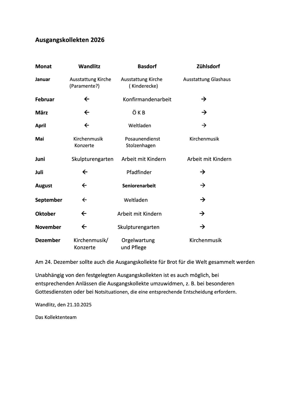 # Einsammeln der Kollekte nach der Predigt und am Schluss des GD, nach der Abkündigung Amtliche Kollekte während des Liedes sammeln und nach vorne bringen und Liturg*in übergeben (ggf. nur eine Kollekte am Ausgang im Korb – wird dann durch 2 geteilt)